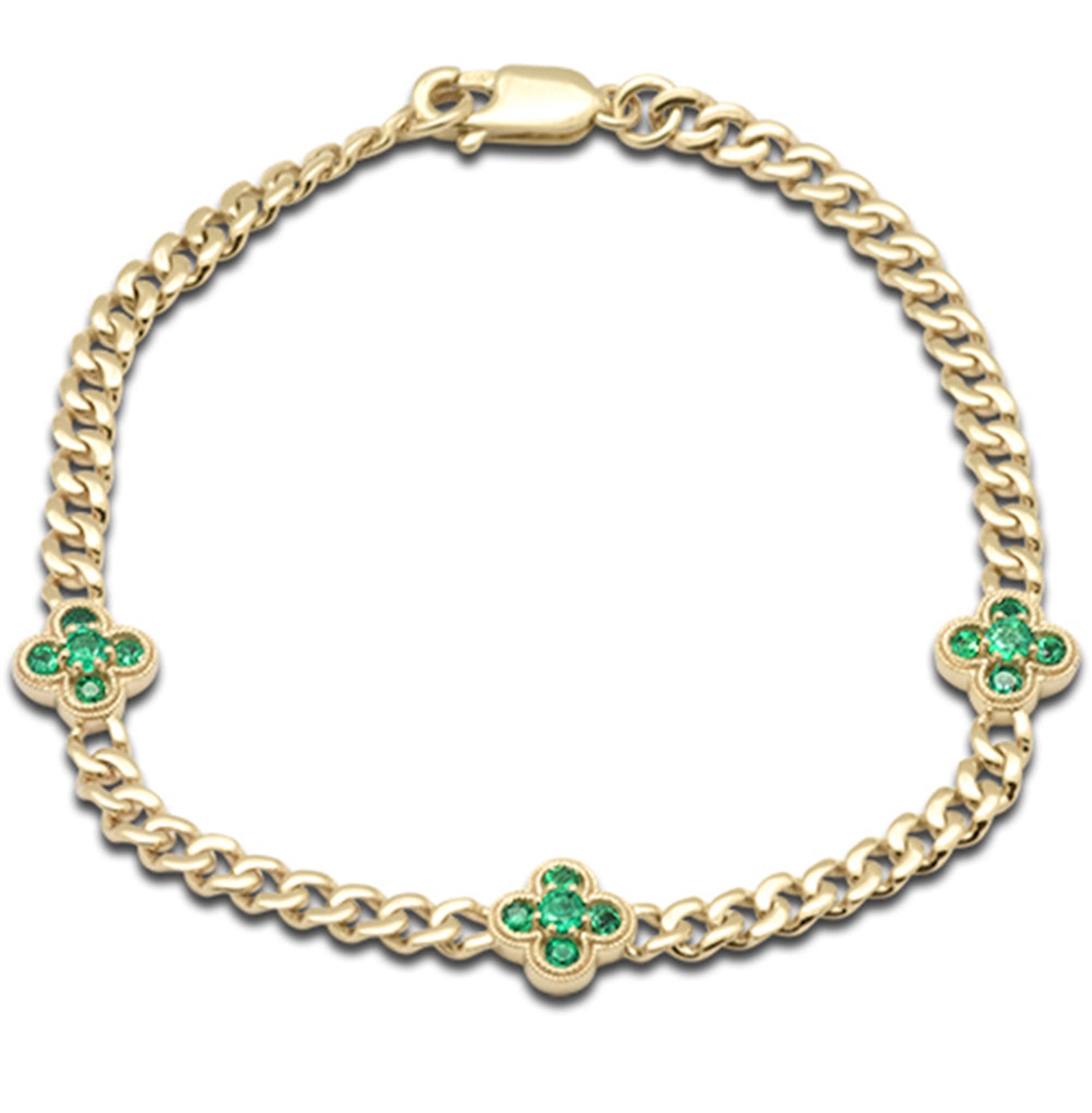 Crafted from premium 14k gold, this Cuban bracelet features three distinctive clover stations adorned with 0.52 carats of natural emeralds. Measuring 7 inches in length with a substantial 3.7mm width, this piece offers a perfect balance of elegance and presence. The meticulous arrangement of emeralds creates a sophisticated design that distinguishes this bracelet as a truly exceptional addition to any fine jewelry collection.