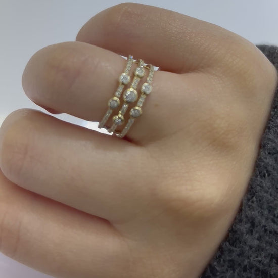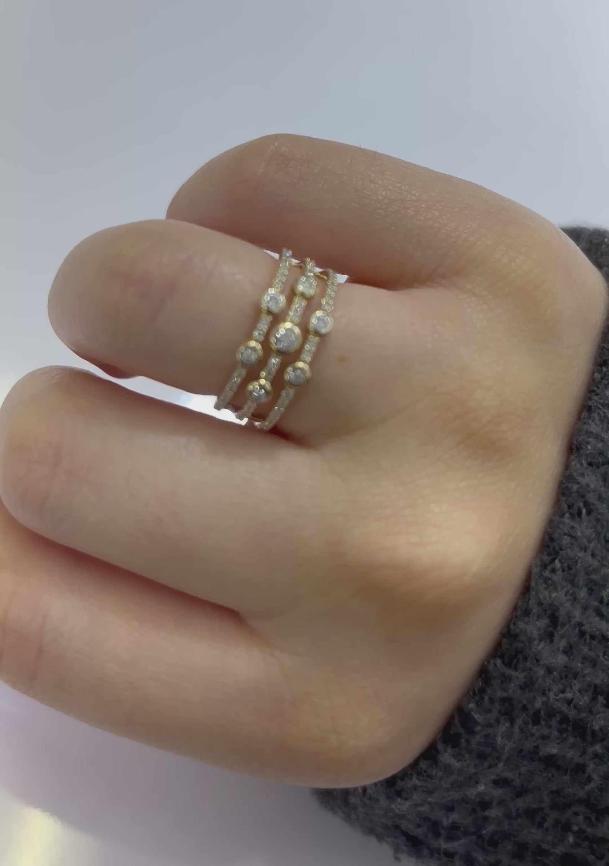 Expertly crafted 14k gold multi-band ring featuring 0.35 carats of natural diamonds in a distinctive bubble design. Seven bezel settings create a sophisticated yet playful aesthetic, with each diamond precisely positioned to maximize brilliance. This unique piece offers exceptional versatility for both everyday wear and special occasions.