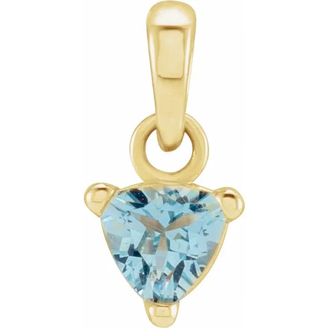 Elevate your collection with this refined aquamarine pendant, featuring a natural trillion cut stone set in 14k gold. The 4x4x4mm aquamarine showcases the gem's distinctive geometric faceting and serene blue hues, creating a sophisticated piece that balances contemporary design with timeless elegance. Perfect for layering or wearing as a standalone statement, this pendant captures the calming essence of aquamarine while the precious metal setting ensures lasting quality and refined aesthetics.