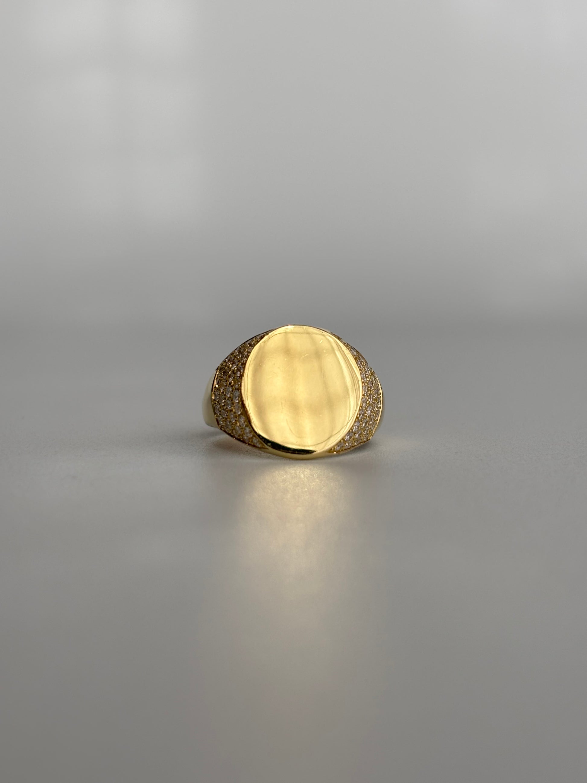 a new take on a classic design. Here is our diamond pave accented signet ring. The surface of the ring is perfect for engraving an initial, a family crest, or even a little message. Whether you keep the face Bear or have it engraved this is a gorgeous and durable piece suitable for every day wear. This piece is made from solid 18k gold.