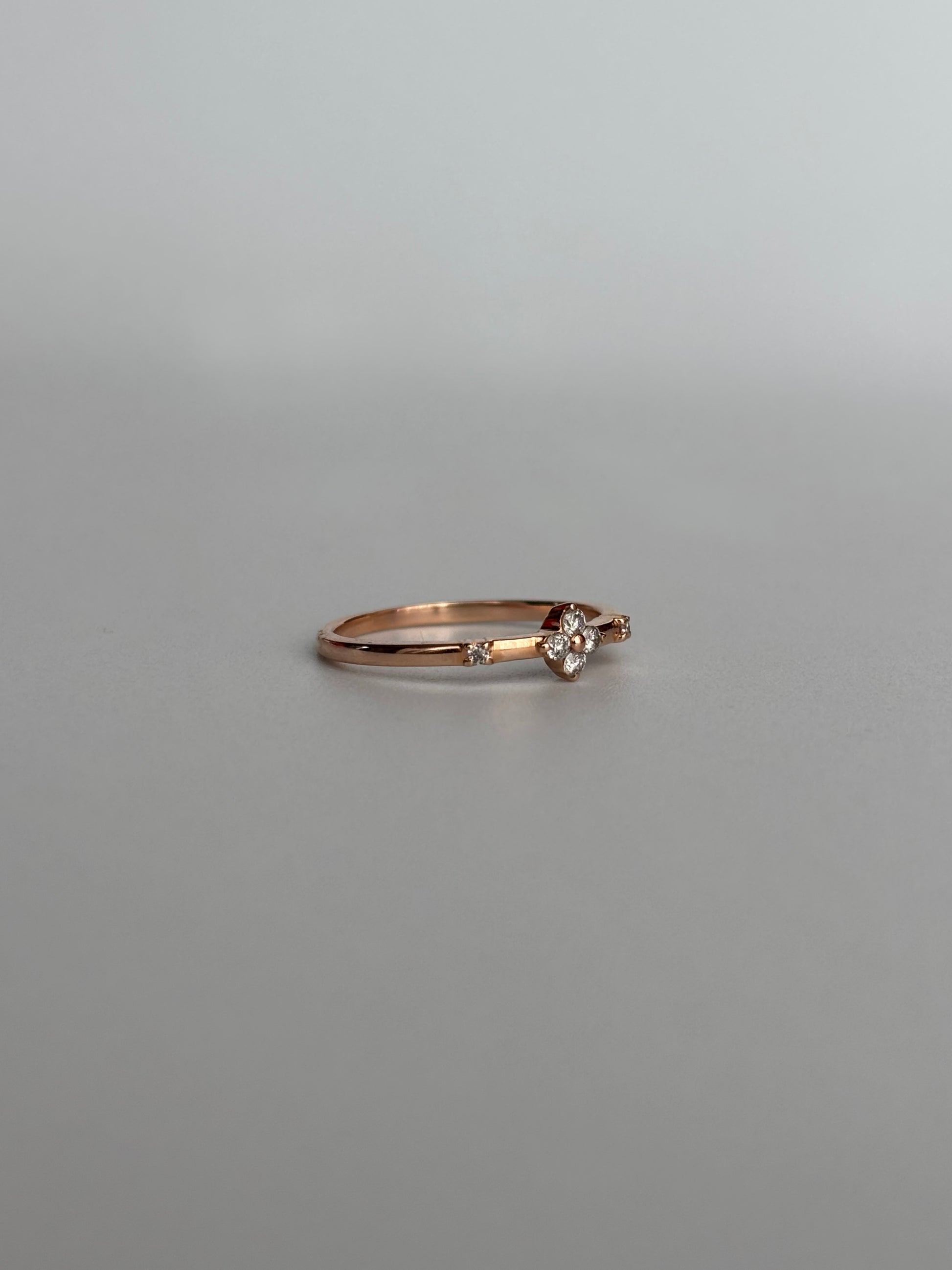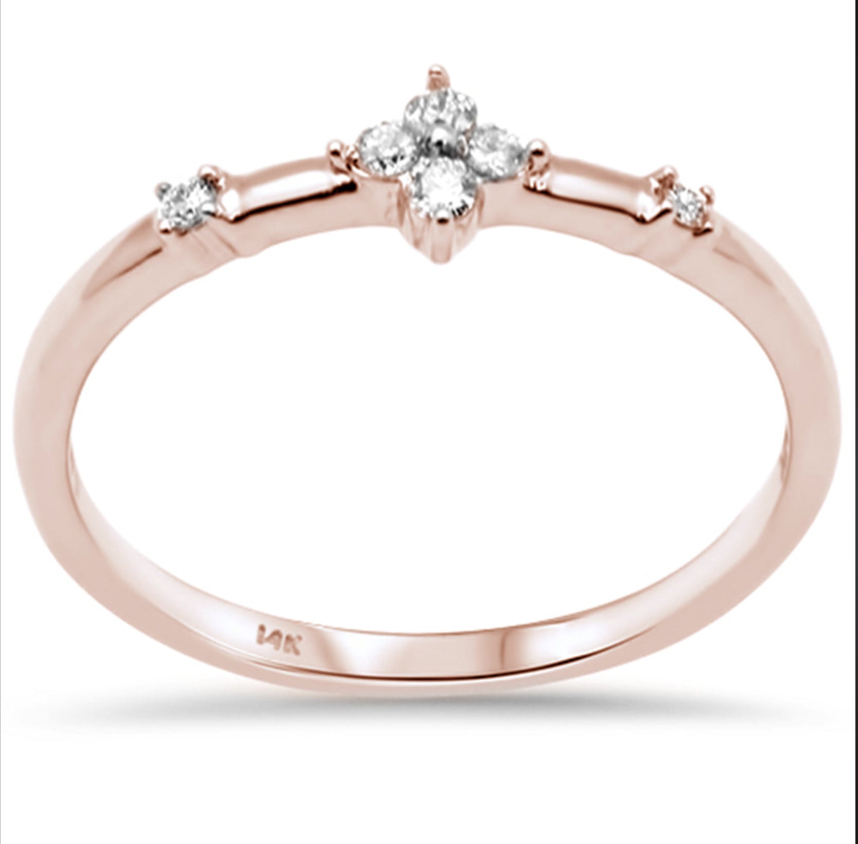 Expertly crafted with 14K solid gold, this Diamond Clover Stacking Ring features natural diamonds totaling 0.11 CTS. The versatile rose gold design, in size 6.5, can be worn alone or paired with other rings for a stylish and elegant look. Elevate your jewelry collection with this timeless and sophisticated piece.