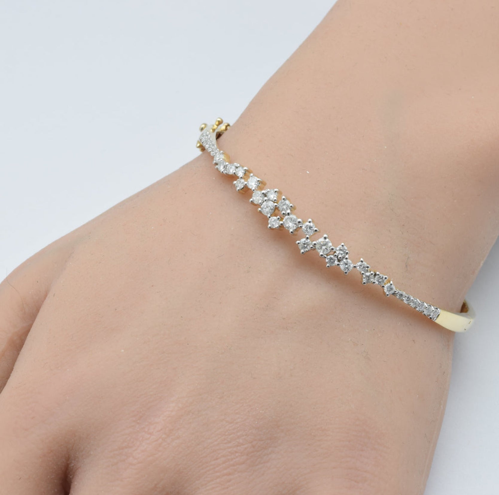 This 14k gold bangle bracelet features 1.24cts of natural diamonds, adding a stunning sparkle to any outfit. Its simple design makes it versatile for any occasion. Elevate your style with this elegant and timeless piece.