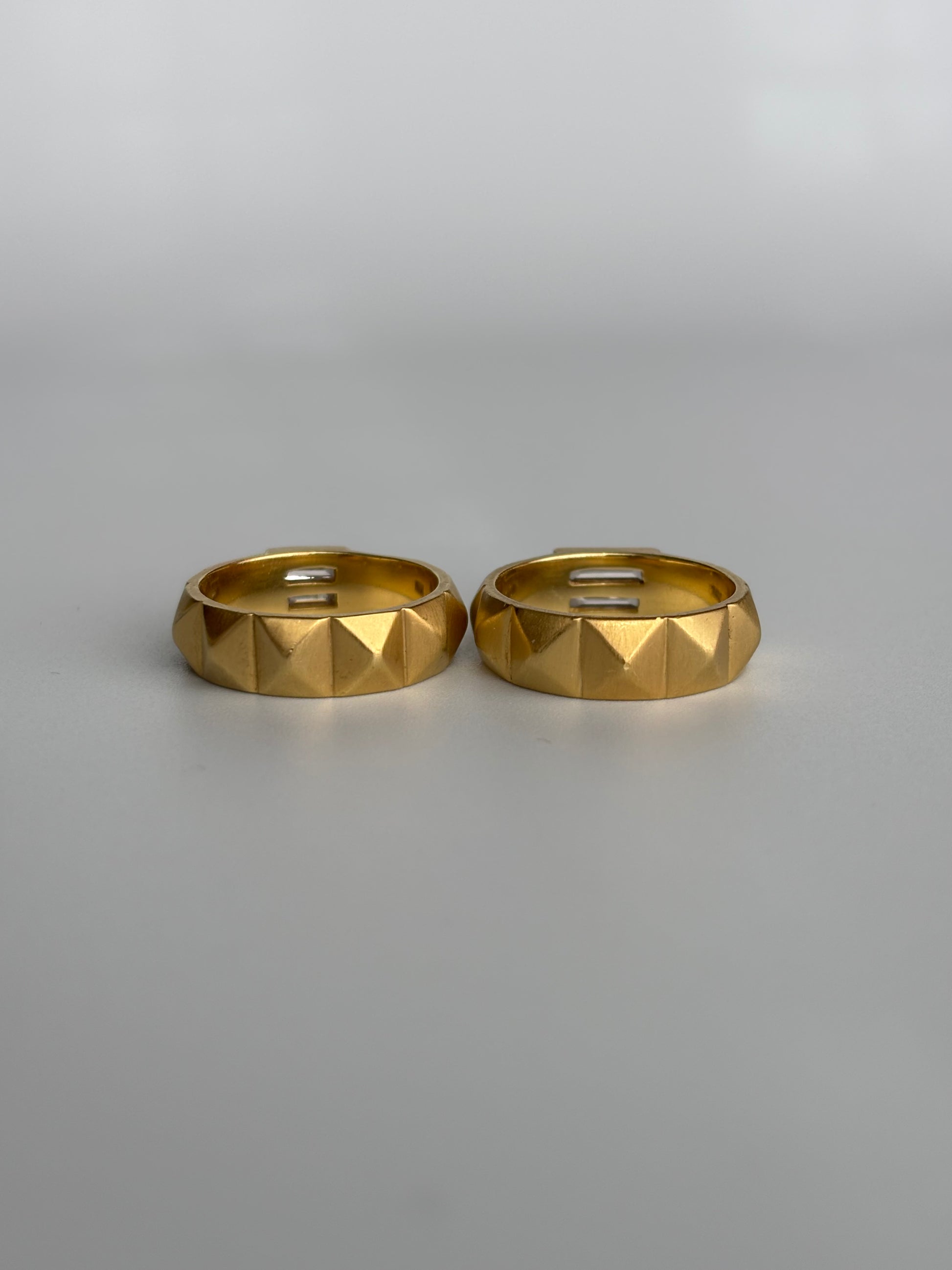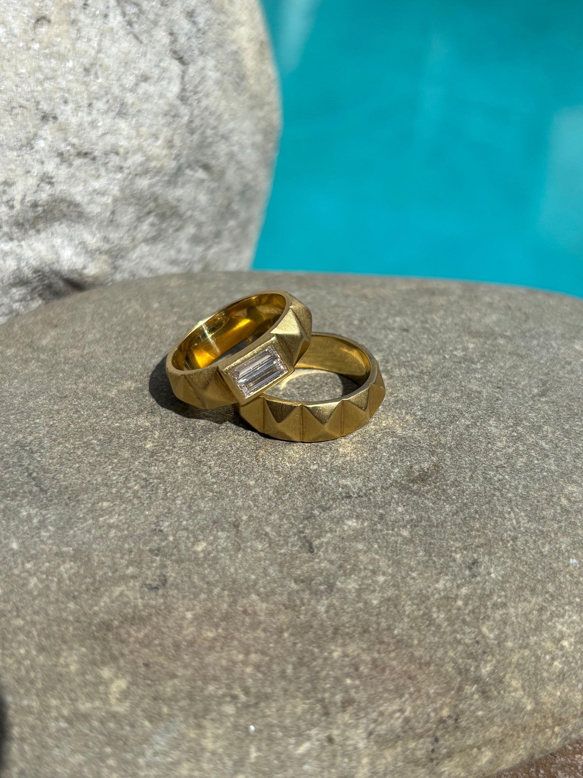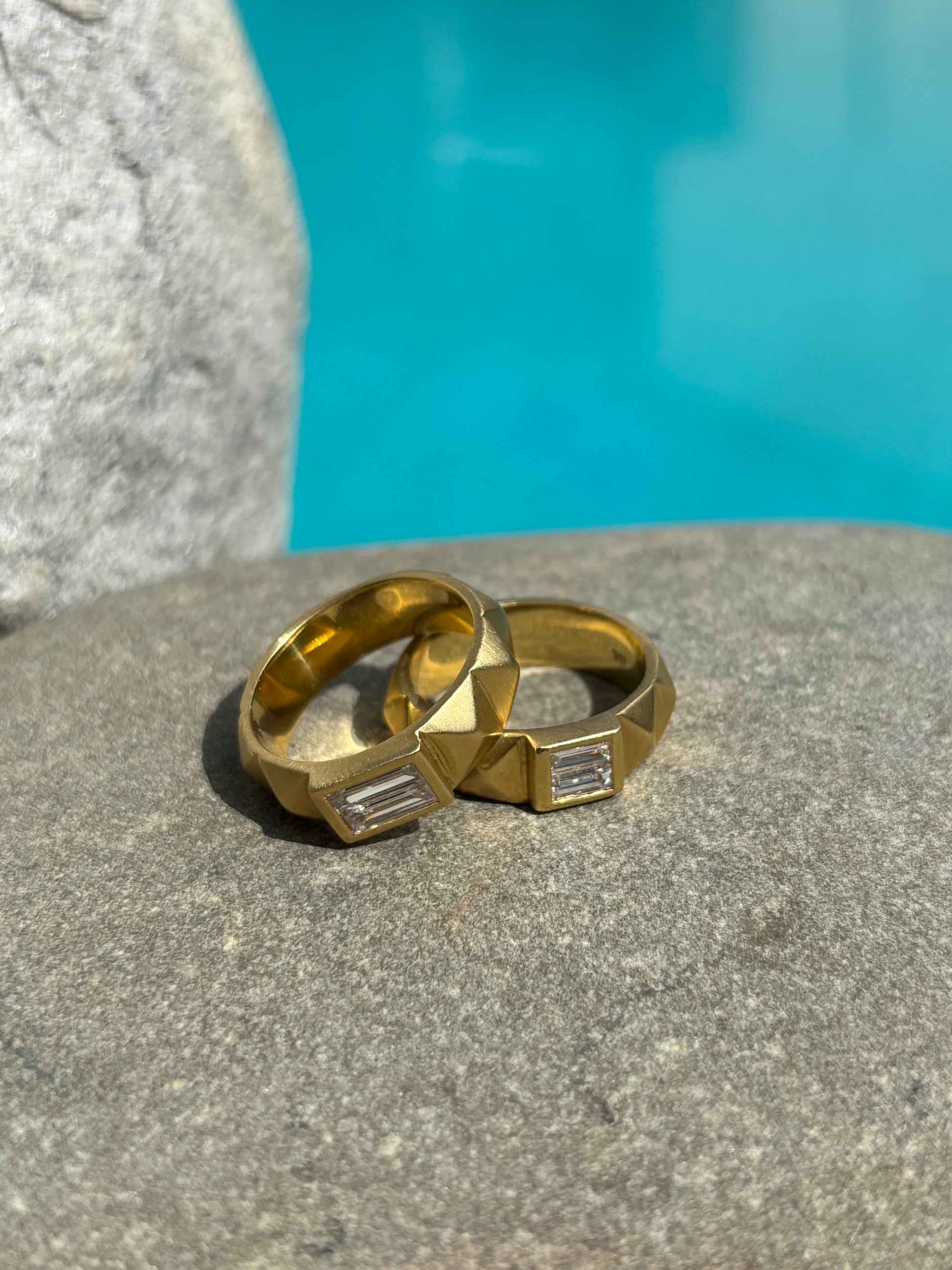 Adding a fun texture to a classic design. Beau Jolie’s original design containing two baguette diamonds in a bezel setting on a gold pyramid band. For some added uniqueness we have made these rings matte. this design is made from solid 18k gold. Like most of our pieces. These are perfect for every day.