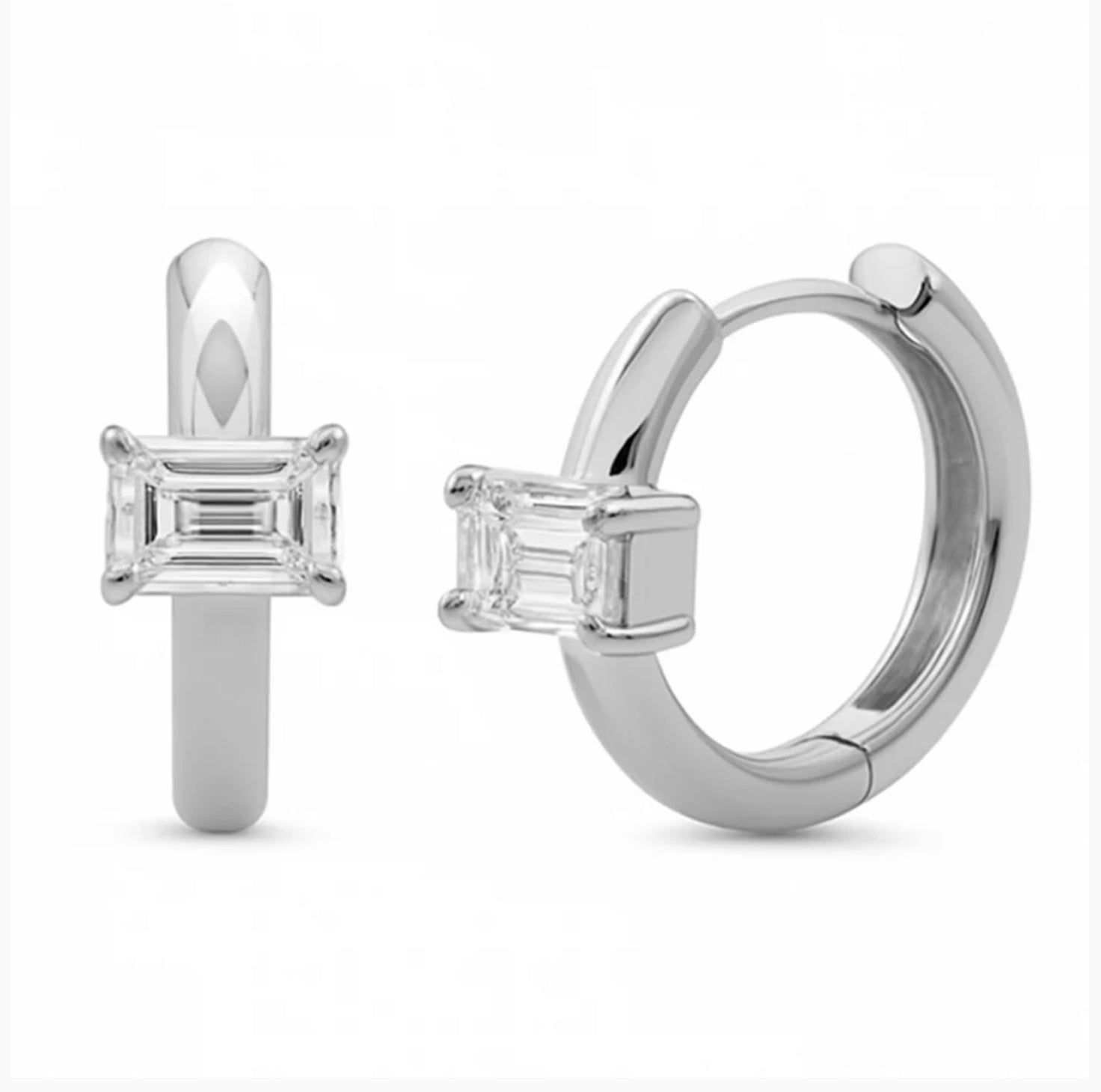 Add a touch of sparkle with these playful East-West Emerald Cut Huggie earrings. Crafted in 14k gold, each hoop measures a perfect 10.5mm diameter, making them ideal for everyday wear. Featuring two dazzling diamonds totaling 0.50ct—0.25cts each—these earrings bring a subtle yet stunning shine to any outfit. Perfect for those who love a little fun with their fine jewelry!