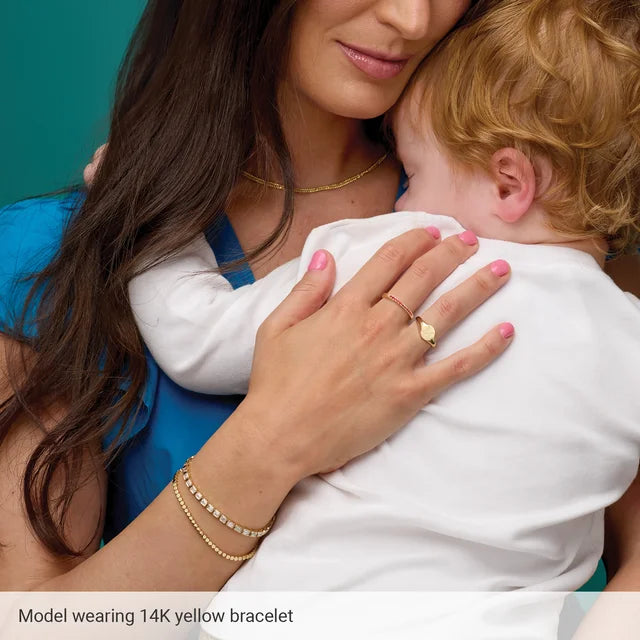 Add a touch of sparkle to your bracelet stack with this Geometric Line Bracelet. Crafted from 14k gold hollow beads, it offers the luxe look of a solid bracelet without the hefty price. Lightweight and unique, it’s the perfect playful piece to mix and match for effortless style.