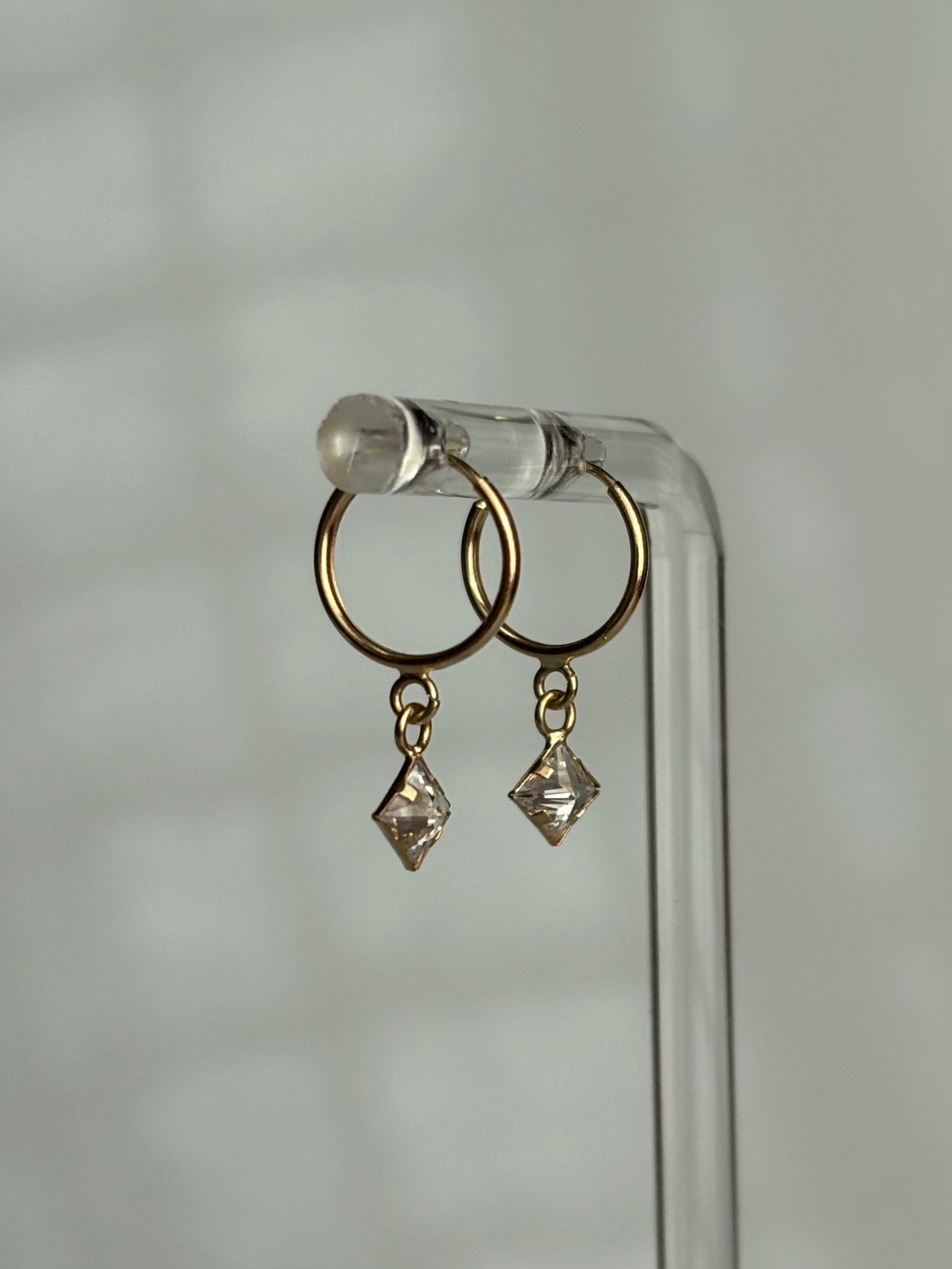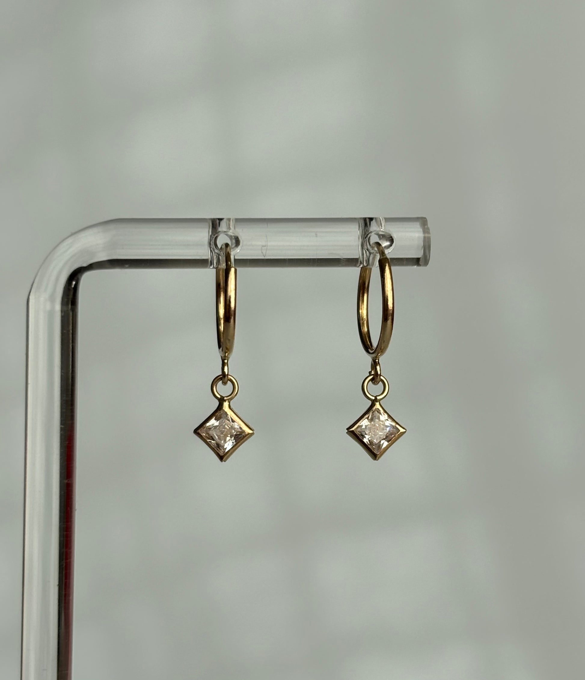 Get ready to turn heads with these Gold Bezeled Princess Dangle Earrings. Crafted from 14k solid gold, these earrings are not only fun and classy, but also sleek. Add a touch of playfulness and sophistication to any outfit. (Warning: may cause envy from onlookers.)
