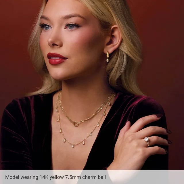 This 14k gold hinged charm bail is an indispensable finding for custom necklace creation. Offered in two versatile sizes—10mm x 10mm and 7.5mm x 7.5mm—it accommodates a wide range of charm designs and pendant styles. The innovative open-and-close mechanism enables effortless charm swapping, allowing you to refresh your pieces without compromising structural integrity. Engineered for both professional jewelers and discerning collectors, this component delivers the precision and reliability expected in fine jewelry craftsmanship. Build distinctive, interchangeable necklaces with confidence.