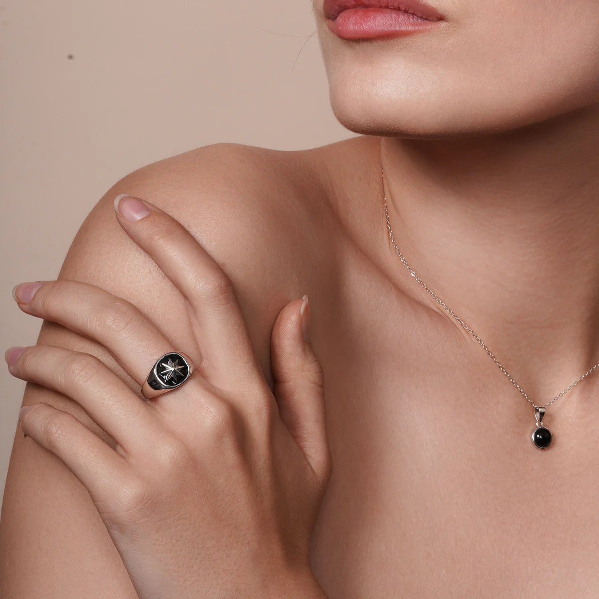 Crafted from 925 sterling silver, this striking star ring combines timeless precious metal with bold black enamel detailing. The contrast between lustrous silver and deep enamel creates a sophisticated aesthetic suitable for both everyday wear and special occasions. Sterling silver's durability and hypoallergenic properties make it an excellent choice for those with sensitive skin. The star motif adds contemporary flair while maintaining classic elegance. A versatile piece that transitions seamlessly from casual to formal settings.
